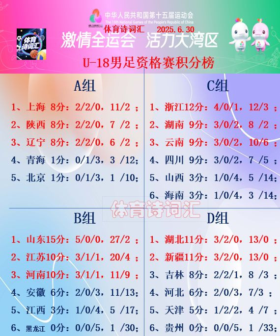 男足U-18组别的资格赛也正式结束,A组的【上海、陕西、辽宁】、B组的【山东、江苏、河南】、C组的【浙江、湖南、云南】、D组的【湖北、新疆】一共11队携手东道主【广东】组成12队的规模,晋级正赛阶段。